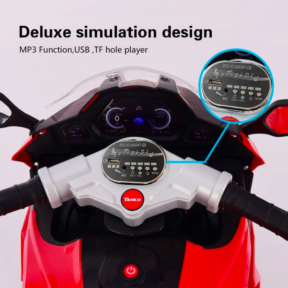 Fancy Style Motorcycle: Super cool motorcycle coming from future. Could play music as well by connecting phone. Lifelike design and realistic sounds effects including engine start and horn,lighting wheels