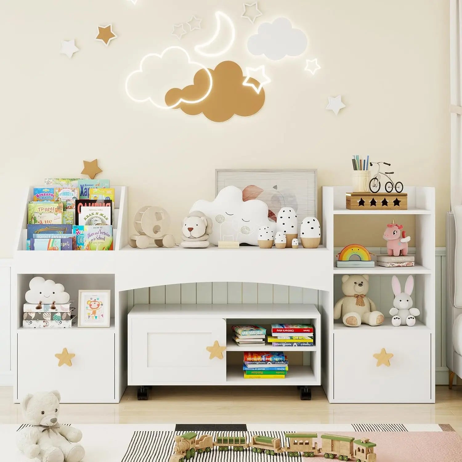 - A three-tier bookshelf, spacious drawers, and a mobile cabinet offer ample, clearly separated storage for books, toys, and craft materials; the mobile cabinet can serve as a bench for quick reads.