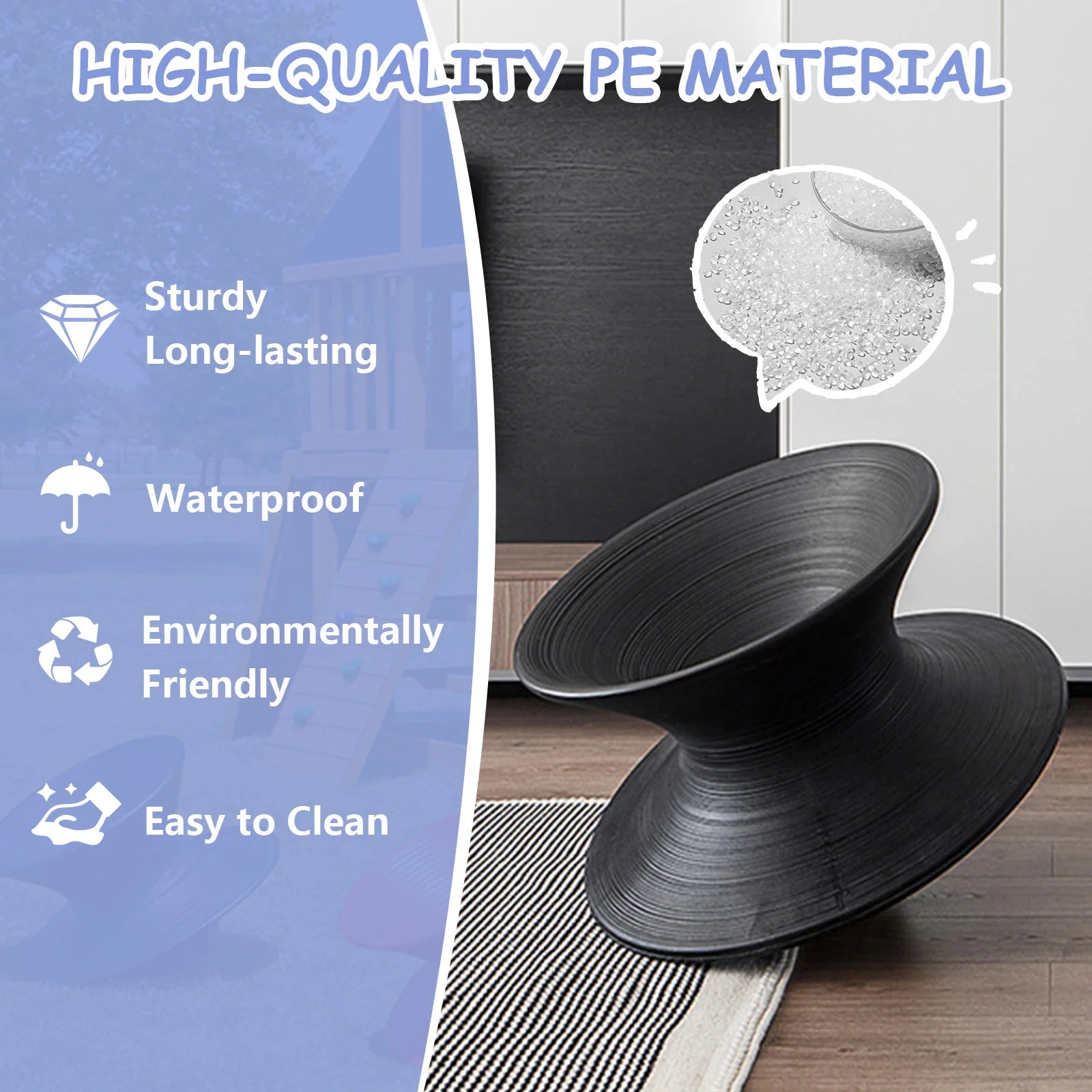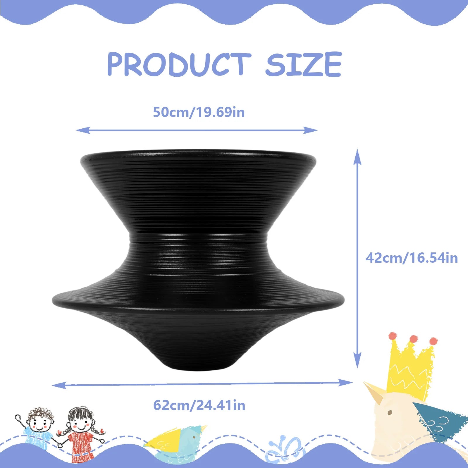 Features: 1.Kids Gyro Spun Chair: This children's spinning chair features a top diameter of 19 3/4 inches (50cm), bottom diameter of 24 3/8 inches (62cm), and height of 17 3/4 inches (45cm). Greatly sized for kids under 7, it lets them enjoy the thrill of rotating freely indoors or outdoors. 2.360° Rotating Seat: Designed to encourage vestibular stimulation, this seat offers smooth spinning that helps develop balance, coordination, and body awareness. It's ideal for energetic children or those with sensory processing needs, providing both fun and developmental benefits. 3.PE Swivel Chair: Made from heavy-duty, eco-friendly polyethylene (PE) in a single molded piece, this chair boasts a wide base and textured non-slip surface for maximum safety, stability, and long-lasting use, ensuring secure play whether placed inside or outside. 4.Spinning Gyroscope Chair: Suitable for home or commercial spaces, including schools, therapy clinics, sensory rooms, playgrounds, malls, daycare centers, and recreation areas. Its lightweight design makes it easy to move and clean for versatile daily use. 5.Spinning Sensory Seat: For safety, refrain from spinning the chair too quickly and do not use on overly smooth floors. Always supervise children during use to guarantee a secure and enjoyable spinning experience every time. Specification: Product size: 620.00x500.00x420.00mm Product size: 24.41x19.69x16.54inch Material: ppOrigin (country or region): Mainland China (Origin) Installation method: Complete installation