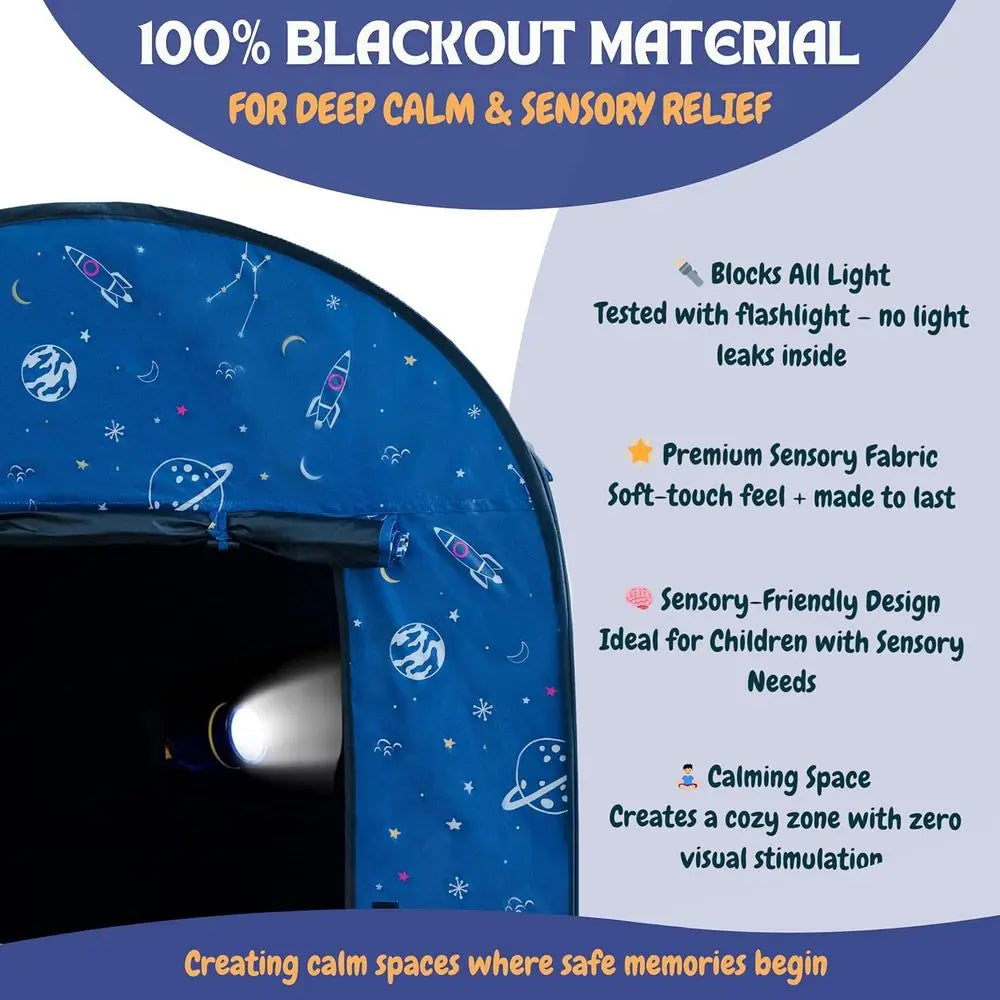 Create a calming, portable sensory space for your child with a quick pop-up setup, soothing LED ambience, and safe blackout privacy.