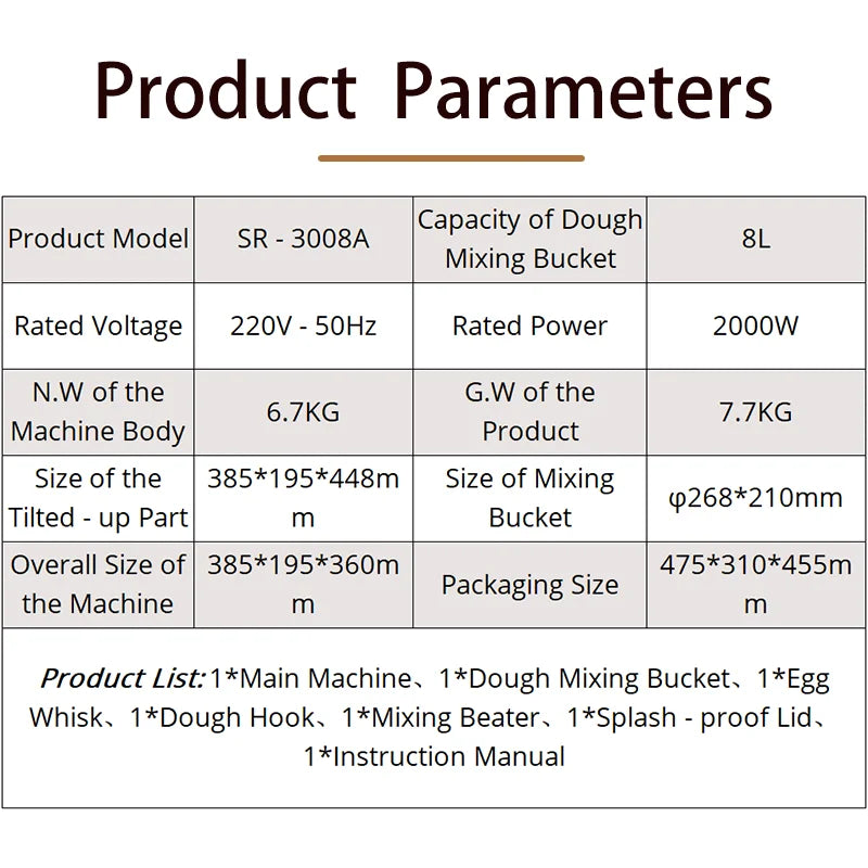 - Power and capacity: 2000W pure copper motor drives an 8L food‑grade 304 stainless steel bowl, kneading up to 2500g of dough in one pass.
