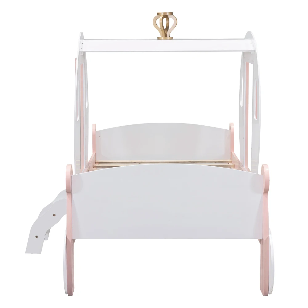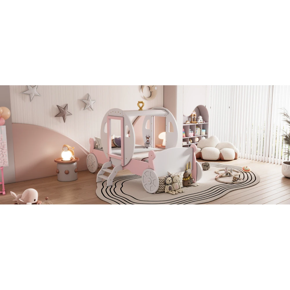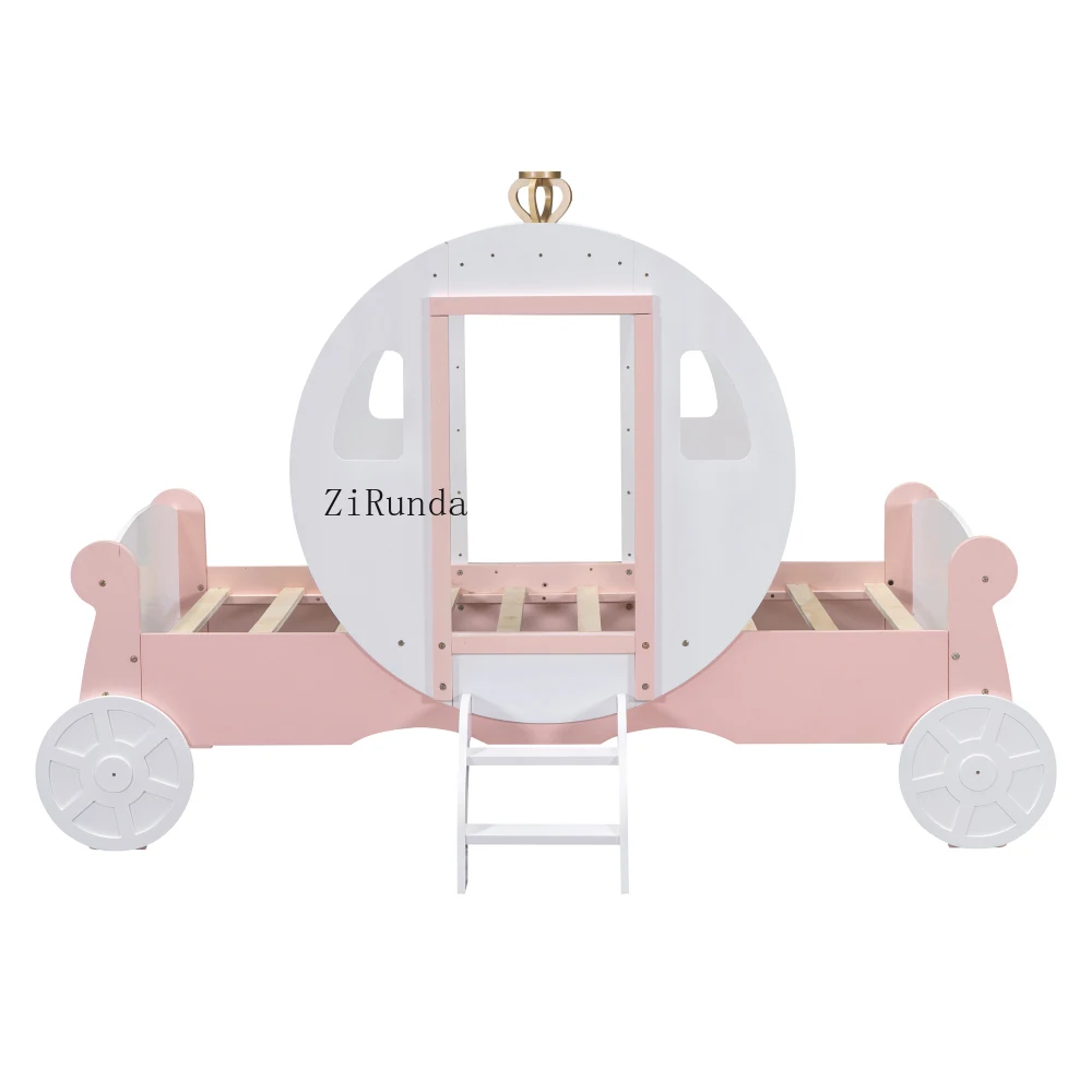 Twin princess carriage bed with crown, wooden platform lathe, stairs, white+pink