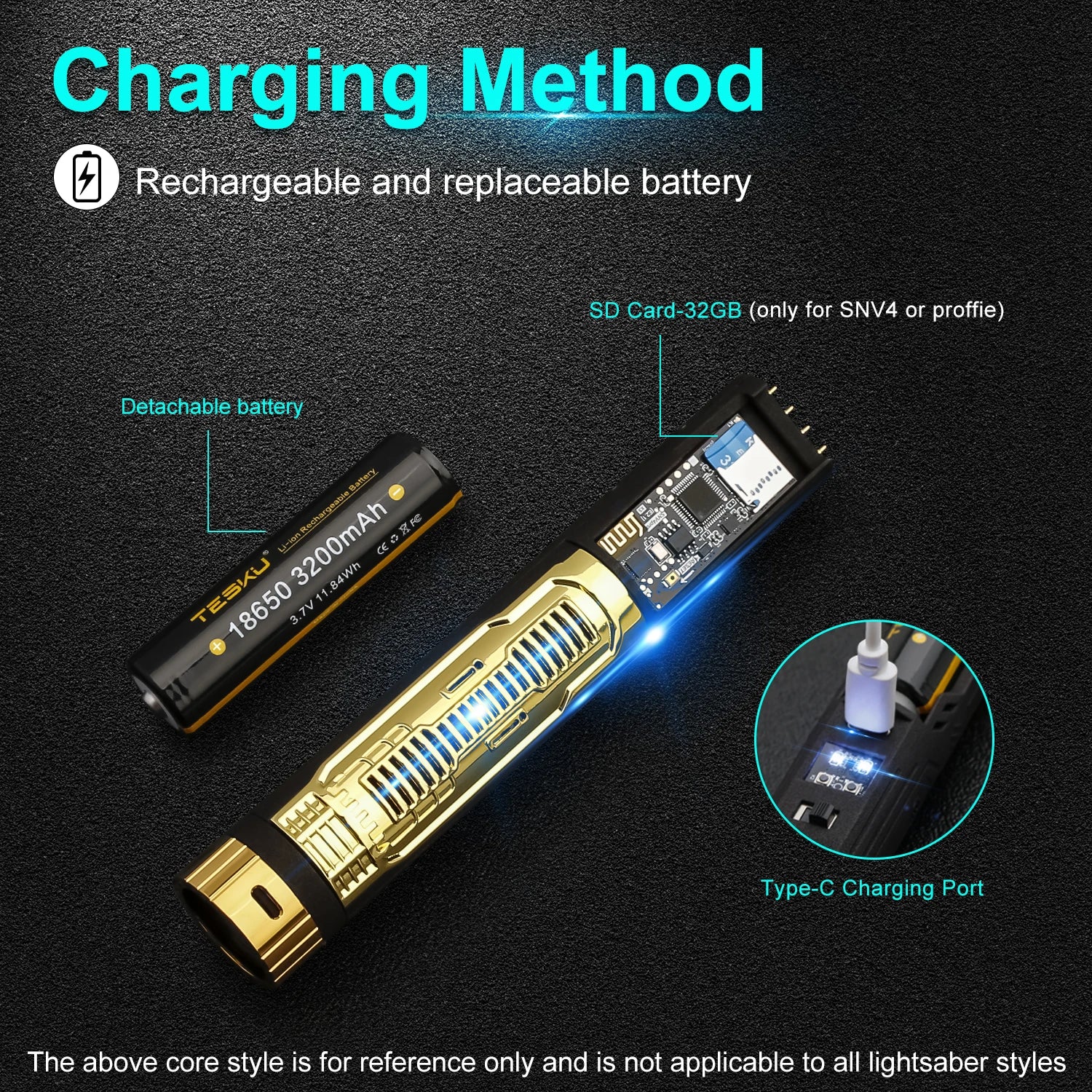 - You power it with a 3200mAh 18650 battery, USB charging, an aluminum alloy 30 cm hilt, blade lengths of 82 cm or 92 cm, and a Proffie board with a 32GB SD Card for expanded sounds.