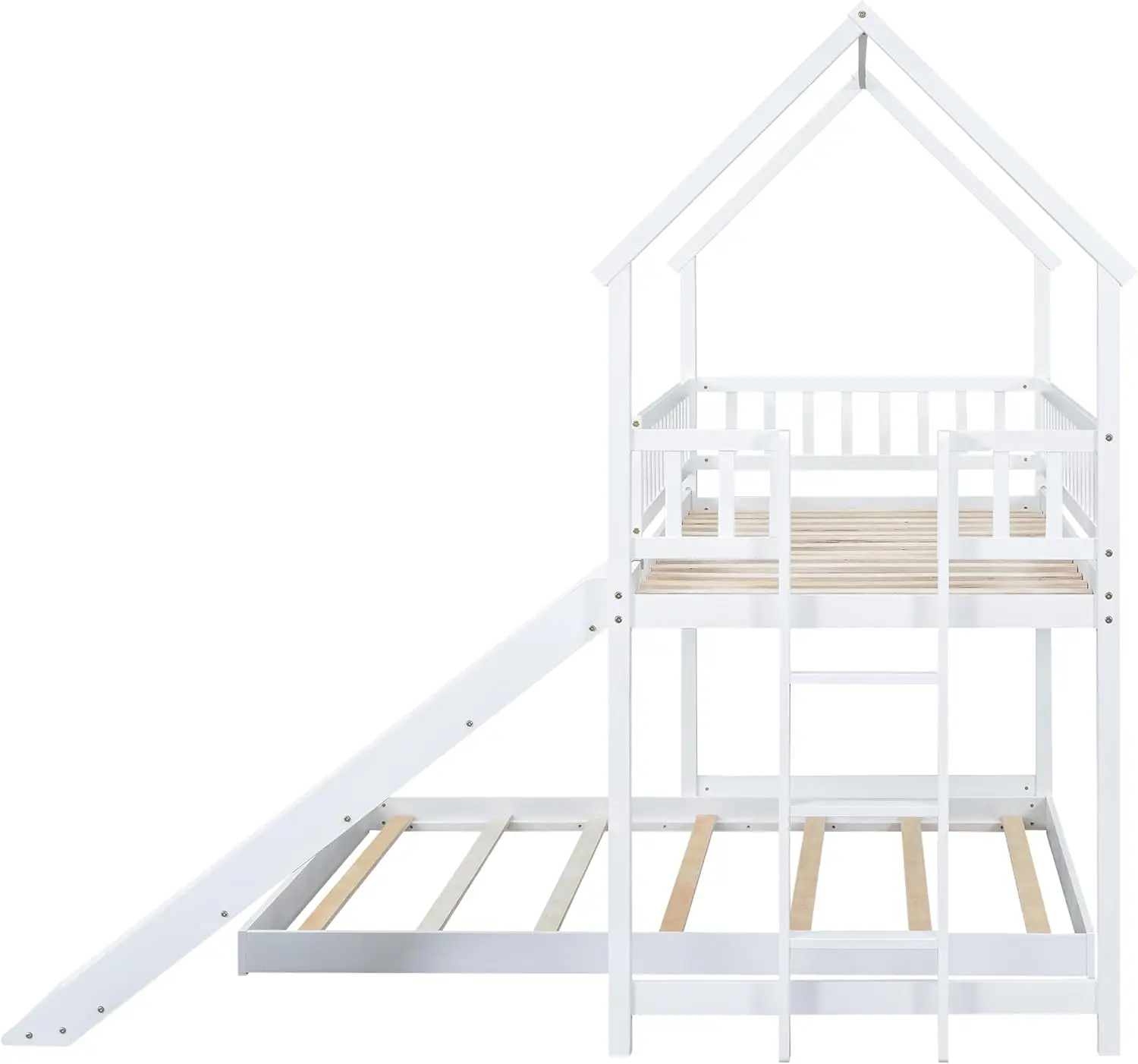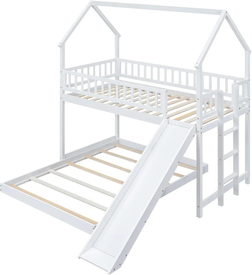 Transform your child's bedroom into a magical and functional space with this wooden twin over full bunk bed. Featuring a charming house-shaped design with a pitched roof and wall section, it creates an adorable play area while providing comfortable sleeping quarters. The top bunk is twin-size, perfect for older kids or guests, while the bottom full-size platform bed offers ample room for restful sleep. This bunk bed includes a built-in ladder that ensures easy access to the top bunk without taking up extra floor space, making it ideal for smaller rooms. For added fun and safety, it comes with a slide that encourages playful activities and a full-length guardrail on the top bunk to prevent falls during sleep or play. Constructed from high-quality solid pine wood and durable MDF materials, this bunk bed frame is robust and built to withstand years of use. It features sturdy wood slats that provide firm support for mattresses up to 8 inches thick, eliminating the need for a box spring and preventing mattress sliding to enhance longevity. Designed with practicality in mind, this space-saving solution maximizes bedroom utility by combining sleeping, playing, and storage areas in one piece. It's easy to assemble with included instructions and hardware, requiring minimal tools. Perfect for siblings sharing a room or creating a cozy guest setup. Key benefits include enhanced safety with secure guardrails, versatile functionality as both a bed and play structure, durable construction for long-term reliability, and stylish aesthetics that complement various decor themes. Ideal for children aged 3-12 years old or as a versatile addition to any home seeking efficient use of space.